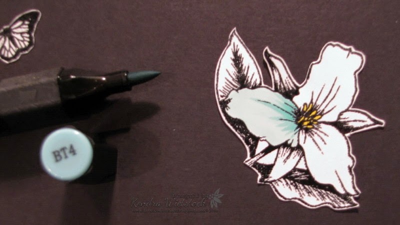 Now it's time to color the flower petals. I started with a very light blue turquoise (BT2) and added it to one entire petal. This will help "prime" the cardstock and accept the colors I add to blend. It is important that you work with one small area at a time {in this case, one flower petal}, so that the markers will blend.